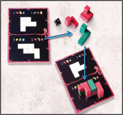 Simultaneously, each player should use their shapes to attempt to completely cover the appropriate white spaces exactly two levels high. No part of any shape should be outside the white spaces nor should any shape be higher than 2 levels.