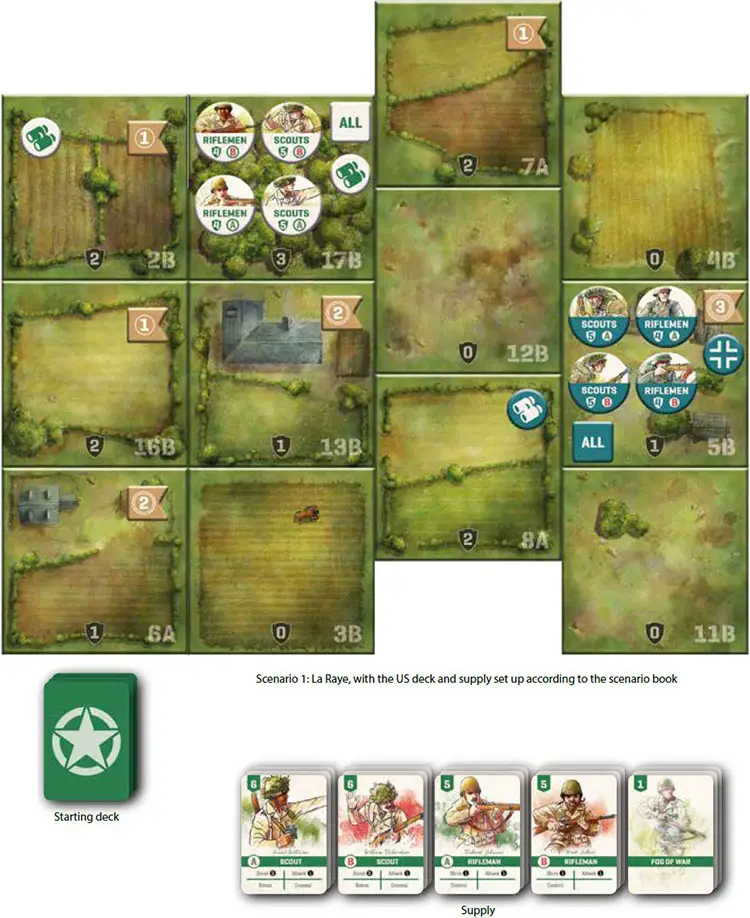 Choose a scenario: Pick a scenario from the scenario book. We recommend that you play the scenarios in order, starting with scenario 1: La Raye, but they can be played in any order.