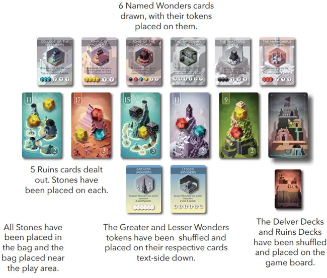 You (and your tribe of Delvers) are competing with the other players to claim the most Ruins and gather the most Stones, which are used to build Wonders.