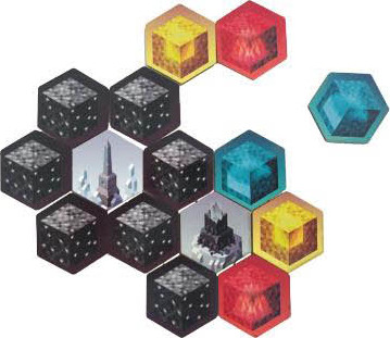 Randomly draw Stones from the bag and place a number of them on each Ruin as indicated by the hex-shaped icon in the bottom right corner of each Ruin.