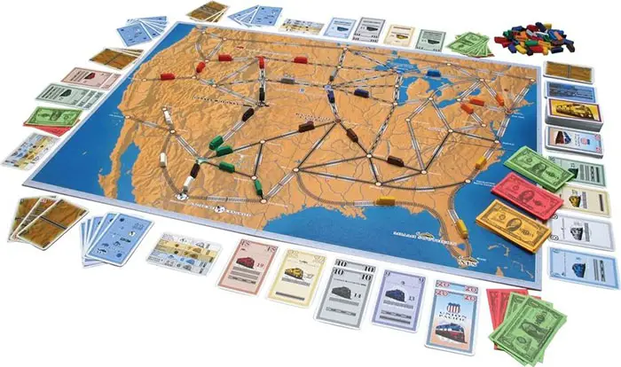 This allows the Union Pacific to serve even more cities. The ten smaller companies are shown on the map with their starting cities and possible track sections they may build. Each track section connects two cities and has spaces for one or more trains.