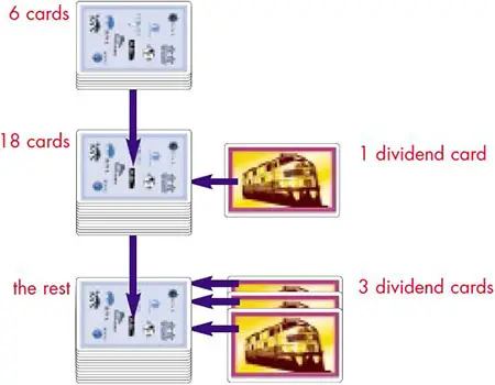 Then separate the remaining share cards into approximately equal stacks. Shuffle one dividend card into each of these. Then build the share card stack by placing one of the "dividend stacks" on the table.