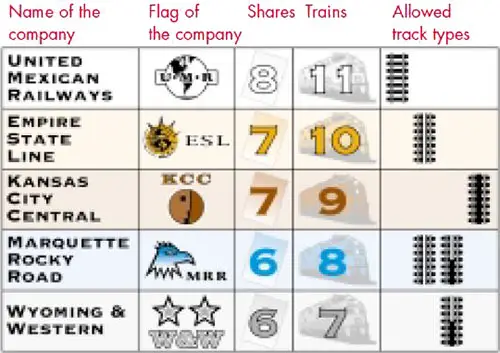 Each player takes one summary card with the share, train, and track information for the 10 railway companies which will have track on the board. As the Union Pacific does not build track, it is not included on the cards.