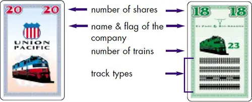 Each railway company has 6 to 20 share cards. Each share card shows the company's name and flag, the total number of shares available, how many trains are available for track building, and the type of track the players may use to add to a company's route.