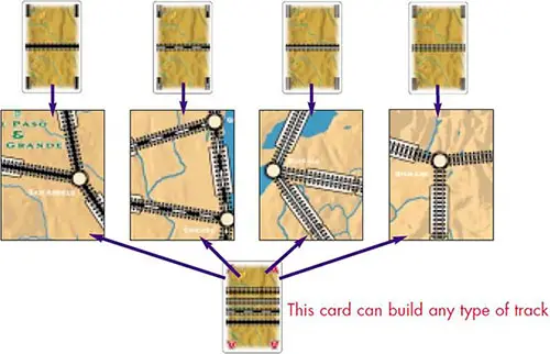 Within the railway system there are four different types of track. Except for the El Paso & Rio Grande (EP&RG), the companies are limited to one, two or three types of track for their routes. The summary cards and the share cards graphically display the types of track a player may use when adding to a company's route.