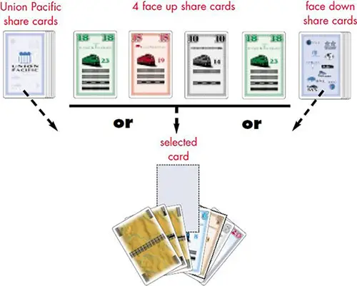 After the player places a train he must draw a share card and put it in his hand. He may choose from the four face up share cards orthe topmost card of the stack of face down share cards ora share card from the Union Pacific stack.