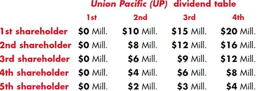 If several players tie for the most Union Pacific shares, the dividends from the table are added for the number of ties shareholders and divided by their number (rounding down, see example).