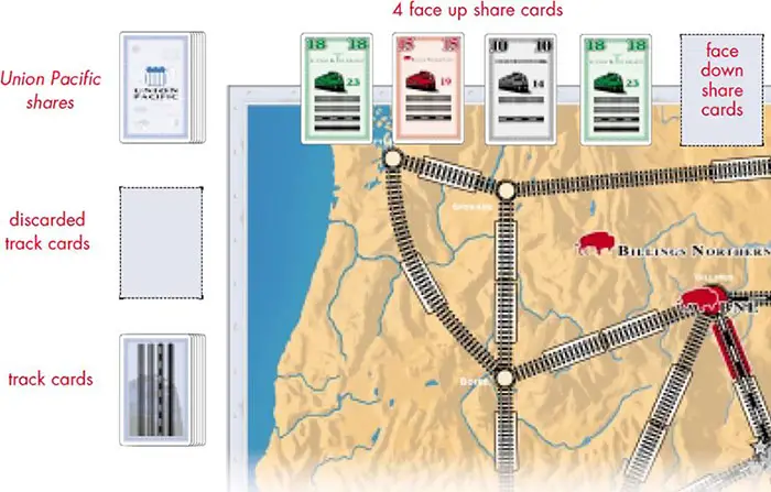 Each player takes one share of the Union Pacific and adds it to the three track cards in his hand. Place the remaining Union Pacific shares in a stack next to the board.