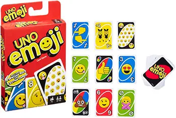 If they stop making the face before their next turn, they must draw 4 cards! You may NOT play an action card (Draw 2, Reverse, Skip, Wild or Wild Draw 4) with the Wild Emoji Card, only an emoji face card.