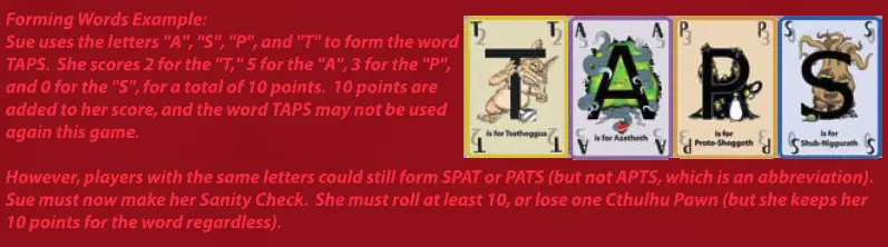 If a player forms a word that bring them 100 or more points, they must succeed at their Sanity Check in order to score. If the Sanity check fails, they score 0 points. If it succeeds, they win the game.