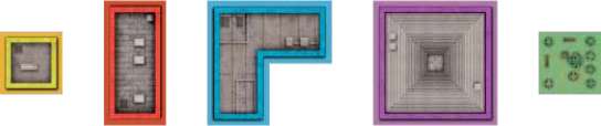 Buildings are the colored tiles of various sizes and shapes placed within the city grid during play, usually as a result of a contract card being built. Parks (green) are also considered buildings for all rules purposes.