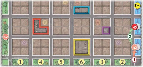 When first entering play, a wealth/prestige marker must be placed into any one of the vacant gray circular spaces around the outskirts of the city grid.