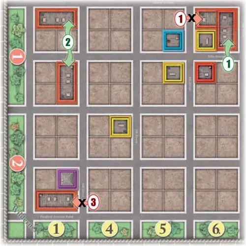 Individual buildings may not straddle the light gray streets (they can't occupy more than one block at a time). When a player builds a contract he takes a building tile of the appropriate color (zone) and size (lots) from the general supply and places it on the board within the confines of the grid limits.