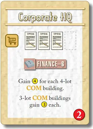 Example: The value of the 4-lot COM building (as well as that of the four lots and the single block that it occupies) begins the game at 8-2 prestige to the left plus 6 wealth to the bottom. Later in the game, the "6" prestige marker gets placed [1] which immediately increases the value of the COM to 14 (2+6+6).
