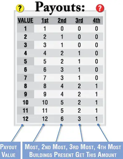 Payout Amounts: The "Payouts" tables - shown at right and on each of the player mats - show how much wealth or prestige is awarded to the players that have the most, second-most, third-most and fourth-most buildings on that row.