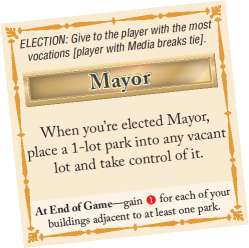 Mayor: The player owning the most vocations takes this tile. If there is a tie for most vocations, the player owning the Media vocation decides which of those tied players becomes Mayor.