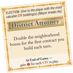 Bonus: When the game ends, the District Attorney gains 1 prestige for each CIV building in play (regardless of ownership).