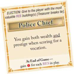 Police Chief: The player owning the most valuable RES building takes this tile. If there is a tie, the tied player owning the greatest number of RES buildings takes the tile. If still tied, the current Treasurer decides which of those tied players becomes Police Chief.
