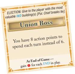 Bonus: When the game ends, the Union Boss gains 1 prestige for each IND building in play (regardless of ownership).