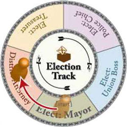 Important Note: At the start of the game the Mayor is the only elected official in play (though initially uncontrolled). The other four politicians can be elected only once the Airport event (in the Town deck) adds them to the game.