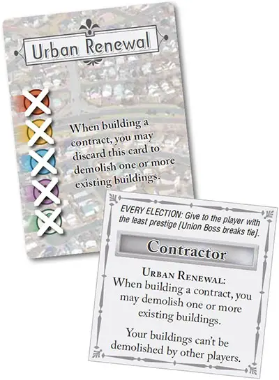 Demolition Ability: Whenever (1) the Contractor player builds a contract, or (2) any player holding an Urban Renewal card discards it while building a contract, that player is allowed to demolish one or more existing buildings, removing them from play. Buildings may be demolished if all three of the following conditions are met: