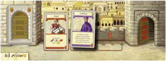Choose Wood, Stone or Brick (you may not choose Gold). Return 4 of the chosen good to the general supply and move your Player figure forward by 4 spaces on the Street board scoring track.