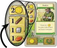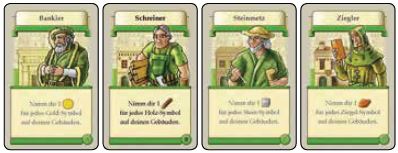 When one of these cards is played, first count the number of goods icons in the lower left corner of all buildings you own (not only green buildings) matching the Character card's good.