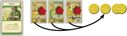 Example: Red plays a Banker. He currently owns 3 buildings showing a total of 4 Gold icons. (The building with 2 Gold icons is an upgraded building). Red takes 4 Gold and places them in his supply.