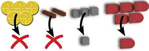 Example: Red would like to build the circled building at upper right. Since he owns two adjacent building, his construction costs are reduced by 2 Gold. He doesn't own any Stone, so he may replace that cost with 2 Wood and 1 Brick. Red's total cost, therefore, is 2 Gold,