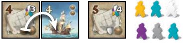 The smaller numbers below this on the Tile indicate the amount of Reals that Vasco da Gama puts at the Players' disposal for the Round. Draw the corresponding amounts from the common supply and place them in the appropriate Slots in the Characters Area.