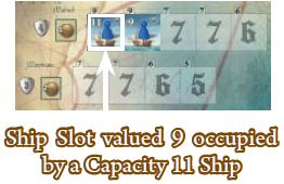 If there are no empty Slots in the next Landing, or there are only Slots with a value higher than its Navigation Limit or if the Ship is already at the complete Landing of Calicut, the moving Ship will stop its navigation and is immediately removed from the game.