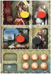 Yellow opts to host Manuel I. He places his Action Disc in the appropriate space, asks Red for the relevant Tile and places it in front of himself: he receives immediately the yellow Additional Action Disc.