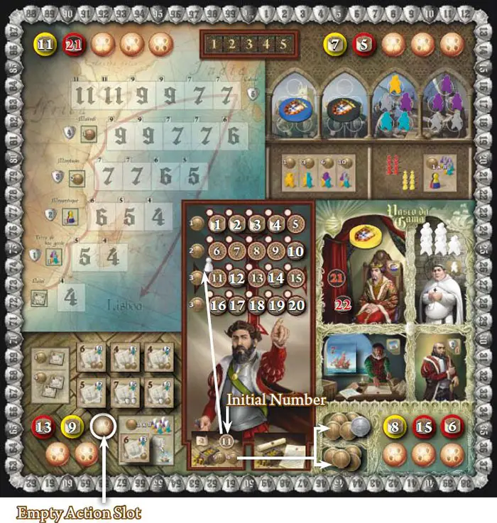 In every Round, each Player will place his 4 Action Discs (5 if he is in possession of the Manuel I Tile. See ahead). By doing this, he options the actions which he intends to take during Phase 2.