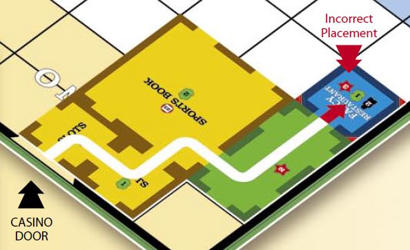 You must be able to trace a route along an uninterrupted path of tiles from your yellow (casino) entrance to each yellow tile you place without passing through any tile walls.