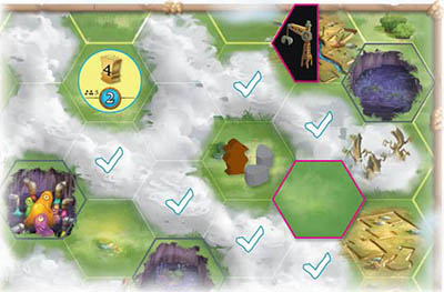 Example : Black decides to explore a fog space. He takes a meadow tile from his board and must place it on a fog space. In the example below, he may cover any space marked with a tick, as they are all either adjacent to a space he occupies or adjacent to an empty meadow space.