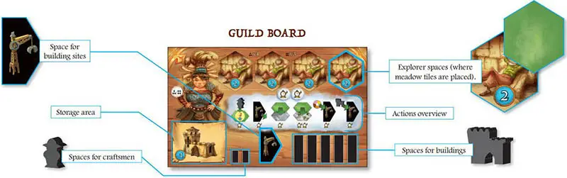 Take a guild board each and all the elements of your chosen color. Place your 5 buildings, 3 building sites and 2 craftsmen on their dedicated spaces (the 3 rd craftsman returns to the game box). Finally, place on your board 4 stacks of 3 meadow tiles.