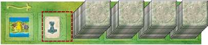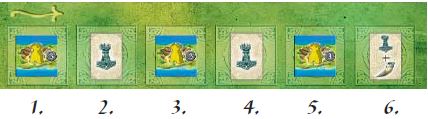 At the beginning of each round, the players lay out an offering of 12 tiles with 12 vikings (see »a completed offering« in figure to the right). First, the start player takes the next stack of tiles from the board (left to right) and places the tiles face up on the 12 spaces next to the wheel.