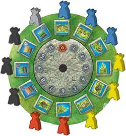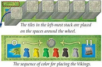 After the scoring, the start player gives the start player figure to his left neighbor, who begins the next round by placing a new supply of tiles and Vikings in the spaces around the wheel.