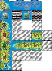 The player's homeland is his base for placing tiles and Vikings. All tiles he acquires must be placed adjacent to this base or to already acquired tiles.
