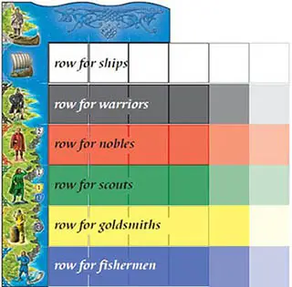 Each player moves his scoring marker on the scoring track immediately to record the points he earns. The players score the Vikings from the top to bottom in their play areas.