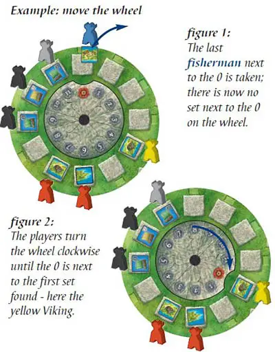 A player may only acquire the set at space 0 on the wheel, when the Viking there is the only Viking of that color still on the wheel (see figure 1).