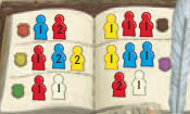 Once 4 pieces have been drawn from the bag (even if they were only black monks), each player may move one or even several of his family members up in the church hierarchy (move them leftward on the windows). Beginning with the starting player and then continuing in clockwise direction, each player may do this once. To move a family member to the next window on the left, you must return as many bags of grain to the supply as are shown between the windows. Your family members may even move up more than one window, provided you pay enough grain to cover all movement.