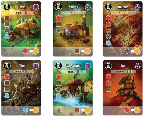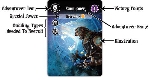 Recruitment Requirements: Adventurers will only come to your Village if they feel comfortable there. Each Adventurer shows a requirement of one or more Building Types. Your Village must have Buildings matching those types, or you may not recruit the Adventurer.