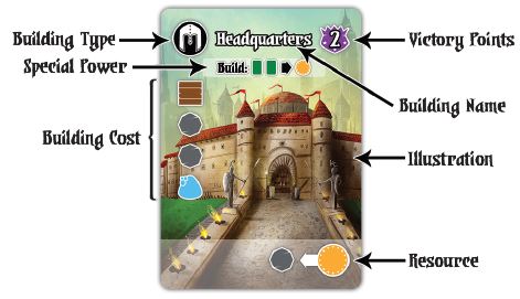 Each Building card has two sections: the Resource section (at the bottom of the card) and the Building section (the rest of the card). Each Building card has a type, shown by a Building Type icon (Worker, Soldier, Shadow, or Holy) in the upper-left corner.