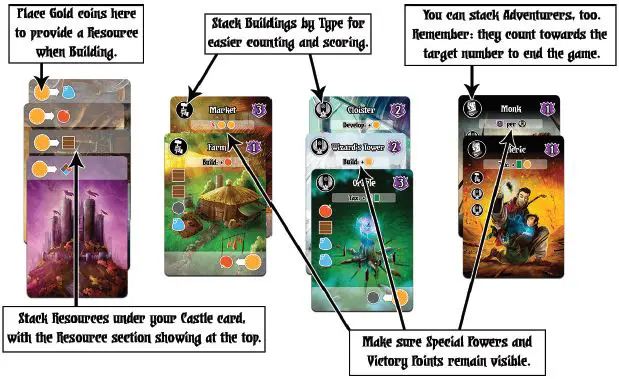 When you build a card as a Building, place it face-up in your Village, to the right of your Castle. The Building's name, Victory Points, and special power (if any) should be visible at the top of the card. We recommend that you group your Buildings by type for easy counting and scoring.