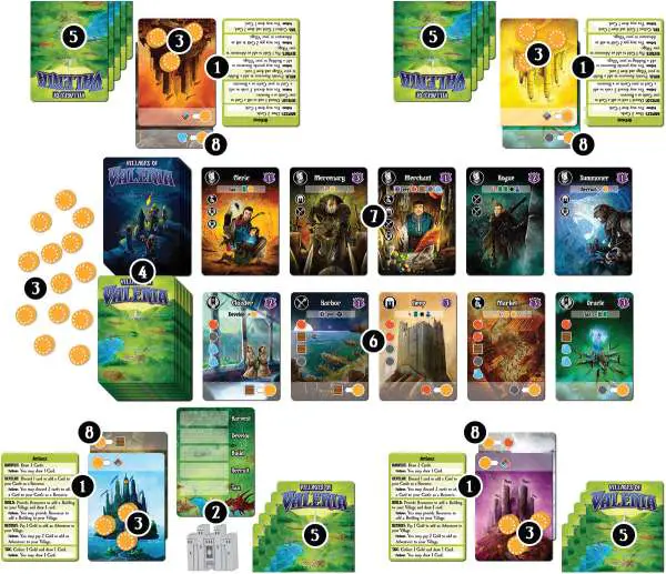 In Villages of Valeria you play the role of a Duke or Duchess, building a village around your castle by playing cards from your hand onto the table in front of you. Develop Resources to build Buildings, which give you Victory Points and special powers.