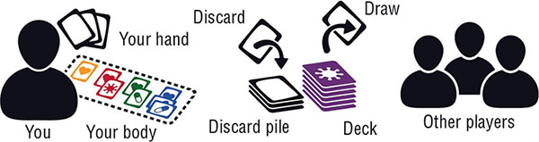 Play the different types of cards by placing them on the table in front of you to build your body, or on your opponents' cards to stop them from completing their body before you.