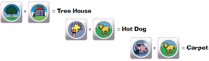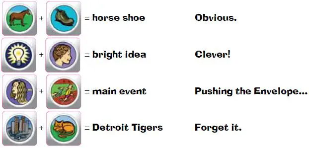 Players race each other to find common two word phrases or single words made from pairs of pictures. (Writing Pads and Timer are not used in Fast Play)