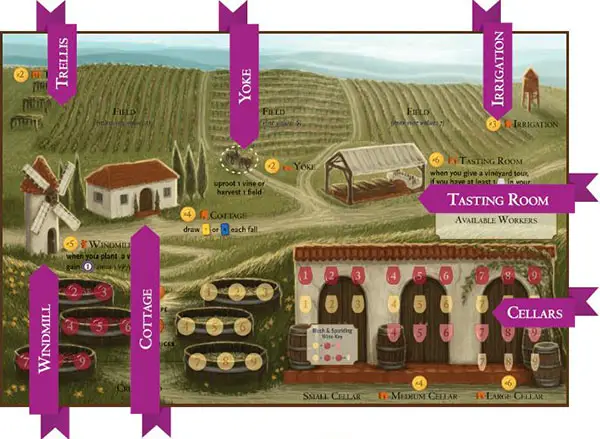 Players store wine in their cellars, but a small cellar affords only enough room for lesser value varieties. Building medium (4-6 value wine) and large (7-9 value wine) allows players to store higher value wines, as well as create and store blush wines in the medium and large cellars and sparkling wines in the large cellar.