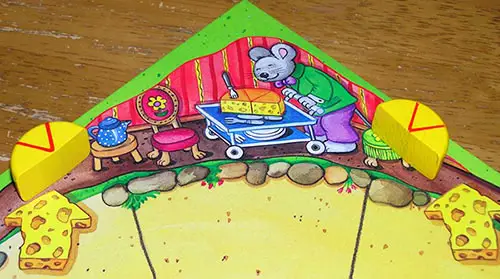 There is plenty of room for lots of different colored mice in the houses but only a limited amount of cheese. When a mouse enters a house, the player may take a piece of cheese as long as there is some left otherwise he will go empty-handed.